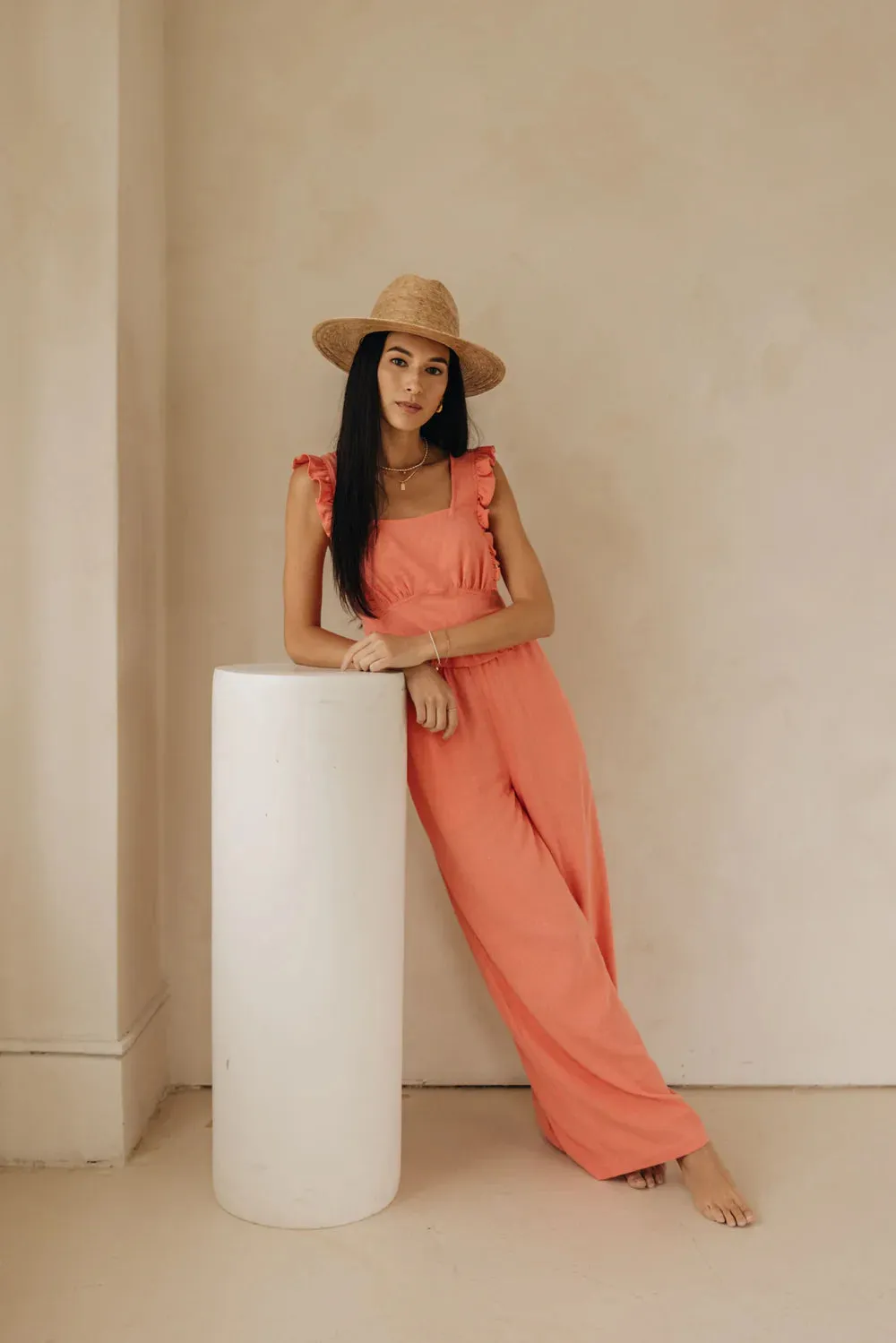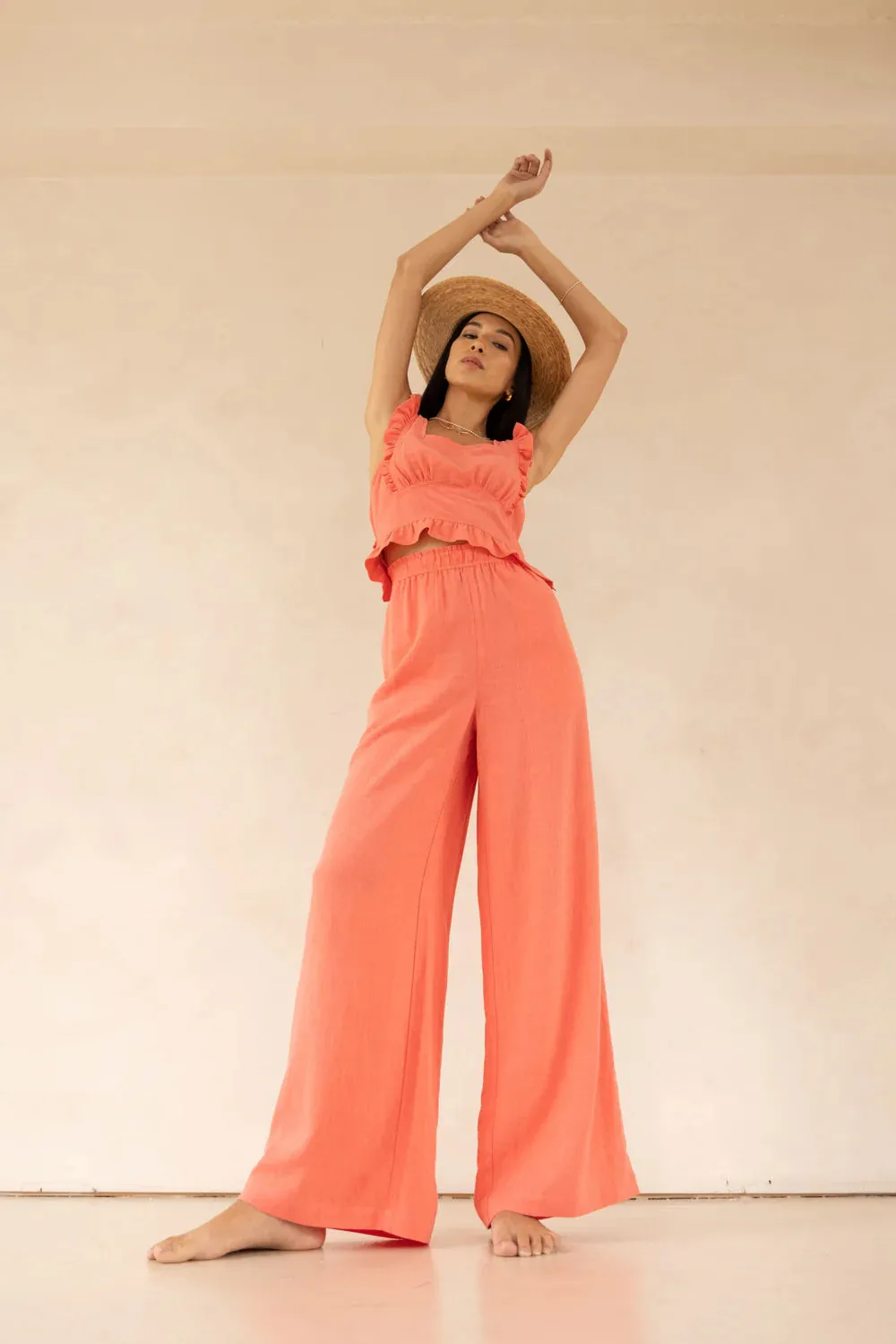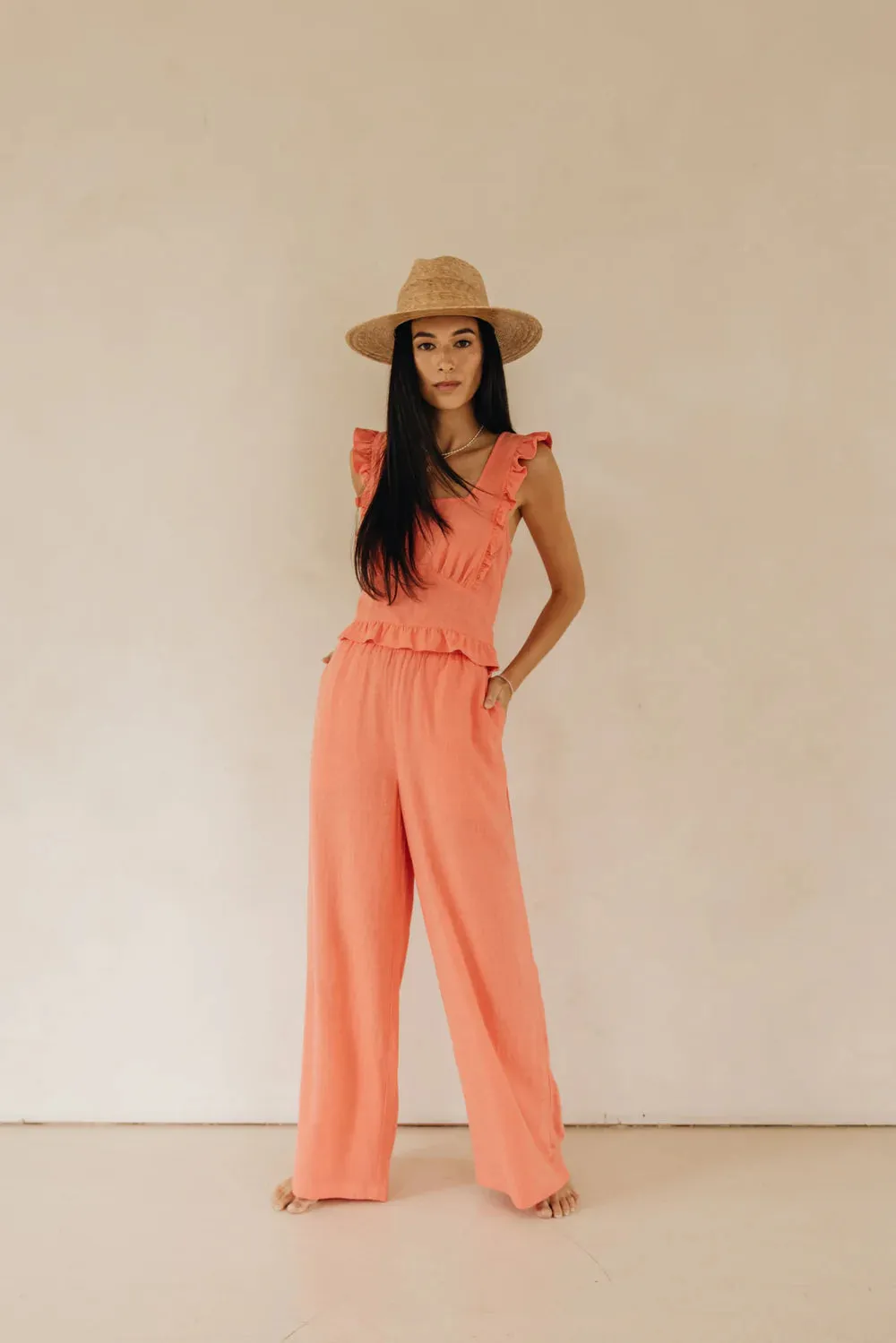 The Bardot tank is made of a linen blend for an effortless look and feel. Features include a side seam invisible zipper and ruffle detailing throughout. Pair it with the Maddox short or Shannon pant for a coordinated look.