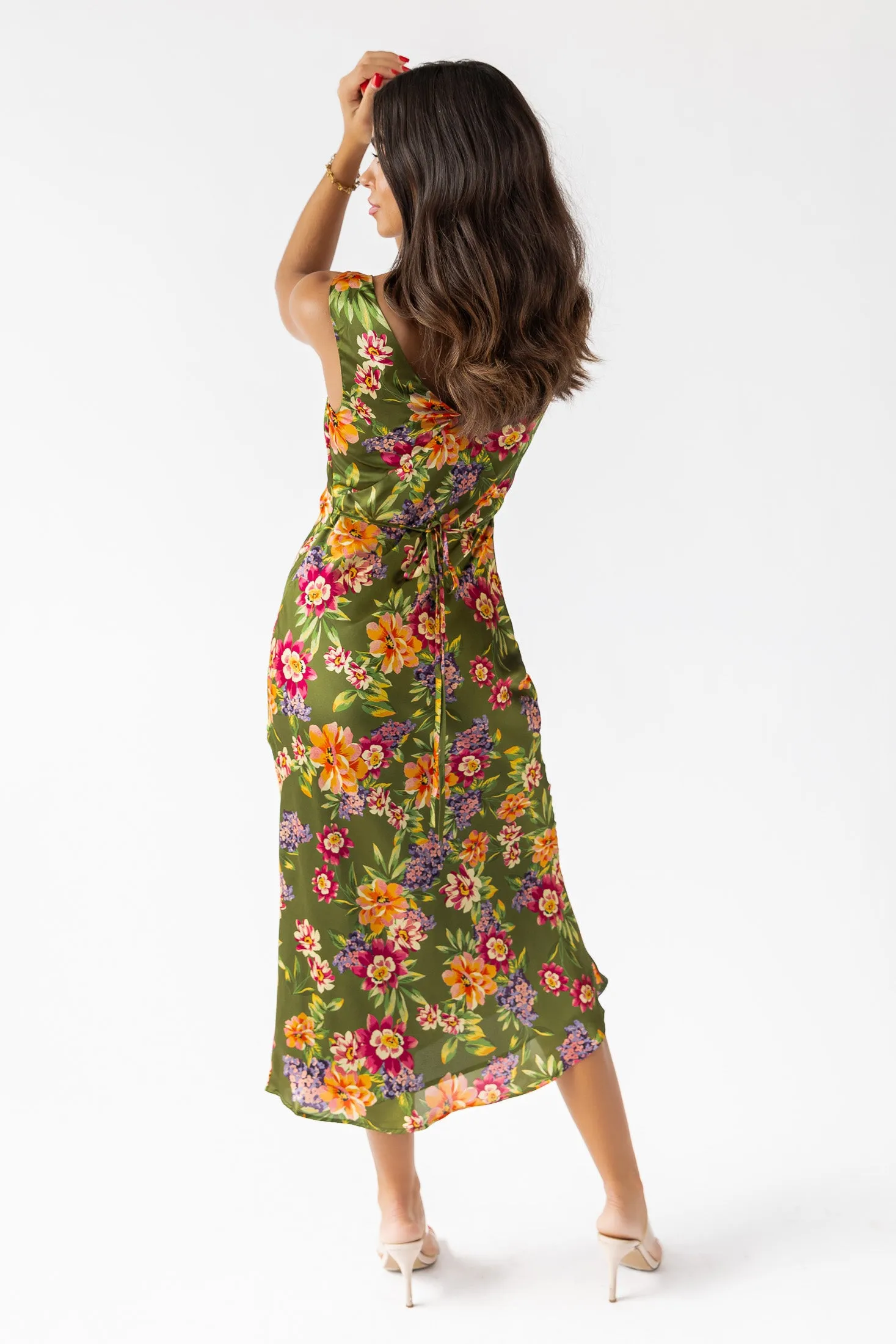 - Sleeveless midi dress with a stunning floral print